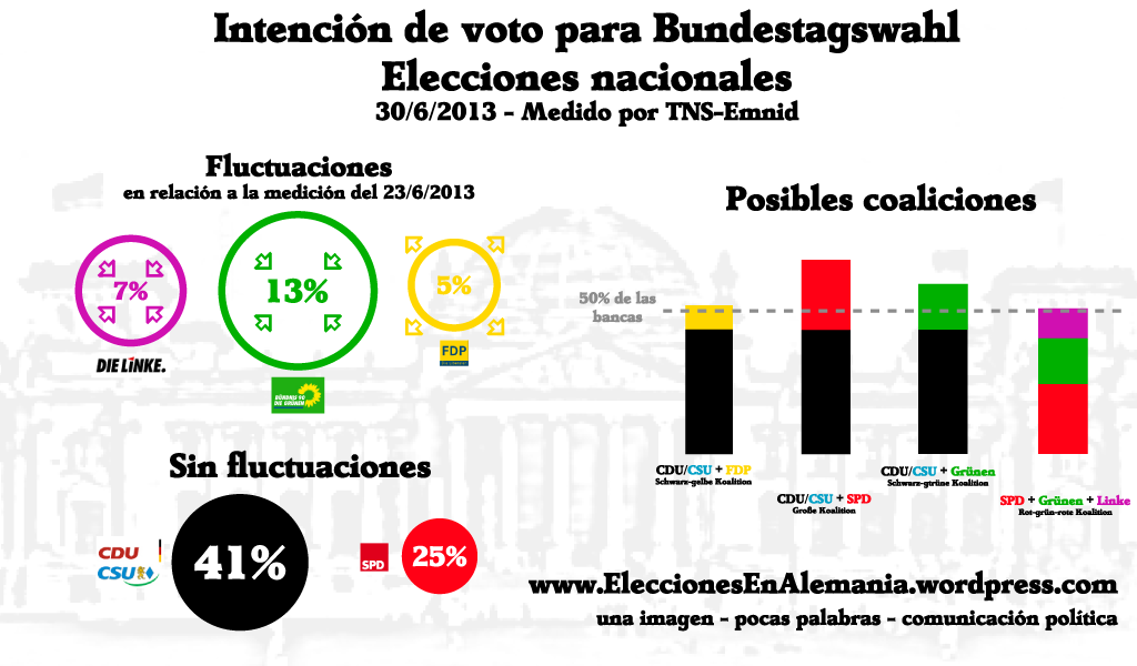 Como cada domingo el instituto TNS-Emnid publicó su medición de intención de voto para las próximas elecciones nacionales. No hubo grandes modificaciones respecto a los números de la semana pasada. La noticia pasa por el regreso del partido liberal (FDP) a los partidos que ingresan al Bundestag. ya que alcanzó nuevamente el piso del 5%.