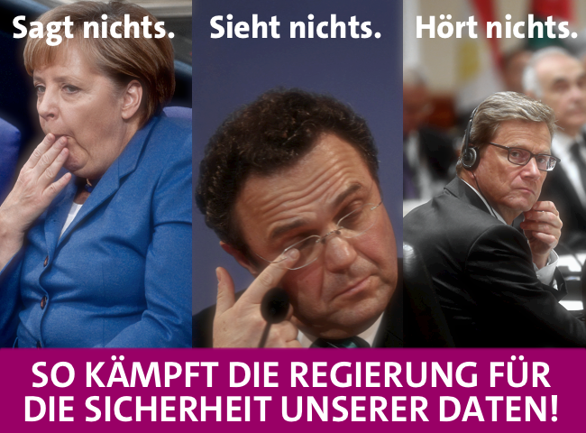 En la imagen se observan a tres miembros de la coalición gobernante, de izquierda a derecha: la canciller Angela Merkel (CDU) que «no dice nada«, el ministro del Interior Hans-Peter Friedrich (CSU) que «no ve nada» y el ministro de relaciones Exteriores Guido Westerwelle (FDP) que «no escucha nada.»