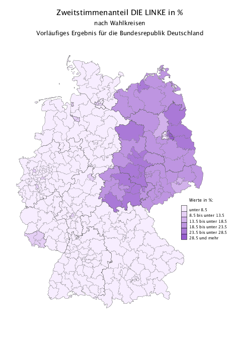 El mapa muestra que prácticamente en todas las antiguas regiones de la RDA die Linke supera el 13,5% de los votos. Muy por encima de la media que obtuvo a nivel nacional (8,6%). La excepción se observa en el centro de la región de Brandenburg, más precisamente en la ciudad de Berlin. Allí la izquierda empeora notablemente su performance en el lado oeste de la capital alemana, el viejo Berlin rodeado por el famoso muro. Otros lugares en los que el porcentaje de sufragios para die Linke están por encima del promedio es Saarland al suroeste (tierra del viejo dirigente del partido Oskar Lafonteine). En los grandes conglomerados urbanos como Bremen, Hamburg y parte del Ruhrgebiet (Región carbonífera der Ruhr) también lograron números interesantes.