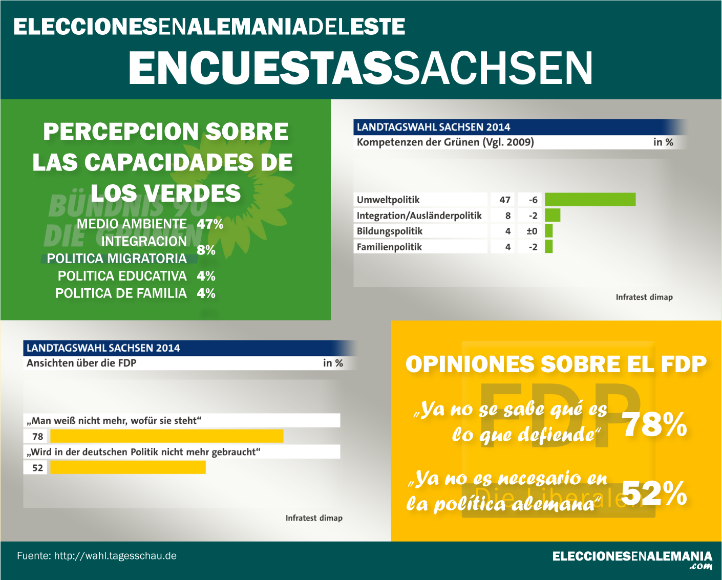 Detalles sobre las elecciones en Sachsen: 1- La percepción sobre los verdes no escapa a su marca de nacimiento relacionada con la ecología. Luego de más de 30 años de vida una fuerza que pretende ser algo más que oposición no puede continuar siendo un partido «monotema». 2- El partido liberal volvió a ser expulsado de un parlamento regional por no haber alcanzado el mínimo de 5%. La percepción negativa sobre el FDP que reflejan las dos afirmaciones del gráfico son contundentes al respecto.