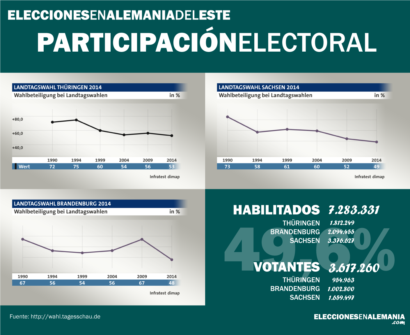 La tendencia general de participación electoral continúa en caída llegando a niveles por debajo del 50%, lo cual beneficia a partidos pequeños como AfD con un electorado motivado y perjudica a partidos mayoritarios con un electorado más amplio y por consiguiente más volátil.