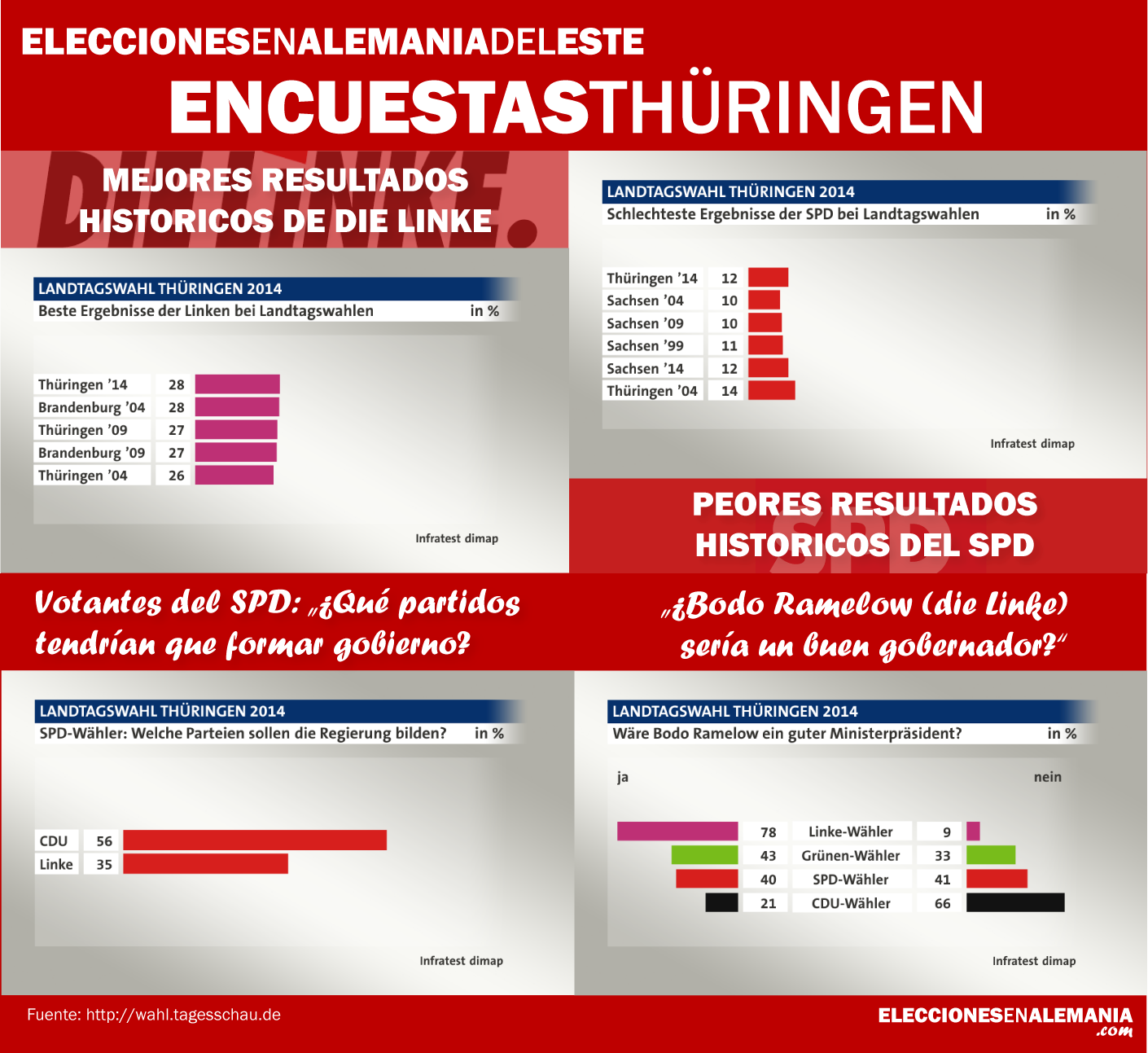 Detalles sobre las elecciones en Thüringen: 1- Para die Linke fue uno de los mejores resultados electorales de su historia, para el SPD uno de los peores de su historia. 2- Bodo Ramelow podría ser el primer gobernador (Ministerpräsident) de die Linke. ¿Lo permitirá el SPD aceptando una coalición tripartita junto a los verdes?