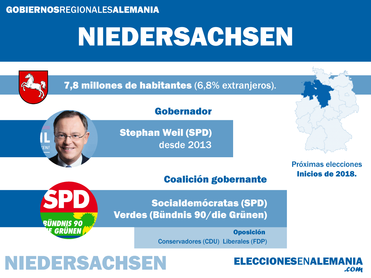 El socialdemócrata Stephan Weil (SPD) es el actual gobernador de Niedersachsen desde las elecciones de 2013 en coalición con el Partido Verde (Bündnis 90/die Grünen). Llegó para relevar al conservador David McAllister (CDU), quien había heredado la gobernación de Christian Wulff (CDU). Wulff renunció a su cargo para convertirse en Presidente de Alemania en 2010, función que tuvo que abandonar dos años más tarde por acusaciones de corrupción. Antes del triunfo de Wulff, el SPD había gobernado Niedersachsen durante 20 años consecutivos (1990-2010). Entre otros, el ex-canciller Gerhard Schröder (8 años) y el actual jefe del SPD Sigmar Gabriel (4 años) ocuparon el puesto de Ministerpräsident.