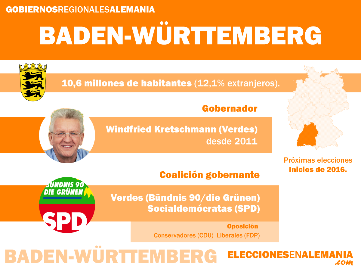La mayoría de los Länder alemanes están actualmente gobernados por una coalición roja-verde, es decir una alianza socialdemócrata (SPD) y verde (Bündnis 90/die Grünen). La región de Baden-Württemberg, que pertenece a este conjunto de gobiernos rojo-verde, posee una peculiaridad ya que es el único Land con un gobernador verde en lugar de uno socialdemócrata. Se puede afirmar que Winfried Kretschmann (Verdes), quien lidera el ejecutivo desde 2011, ha logrado un hecho histórico en la región: le ha quitado la gobernación a la Unión Demócrata-Cristiana (CDU) luego de 58 años. Varios temas se conjugaron para que la CDU pierda el sillón de mando que ocupaban desde 1953. Por un lado, la tragedia de Fukushima en Japón, que reforzaba conciencias en relación a la ecología y el cuidado del medio ambiente; por otro, la pelea por la nueva construcción de una estación central de trenes de alta velocidad denominada Stuttgart 21, que demandaba una inversión millonaria. Hubo un gran número de propuestas contra este proyecto y en algunos casos culminó con enfrentamientos con la policía incluyendo varios heridos. Estos acontecimientos dañaron la imagen de Stefan Mappus (CDU) hasta ese momento gobernador de la región y nuevamente candidato.