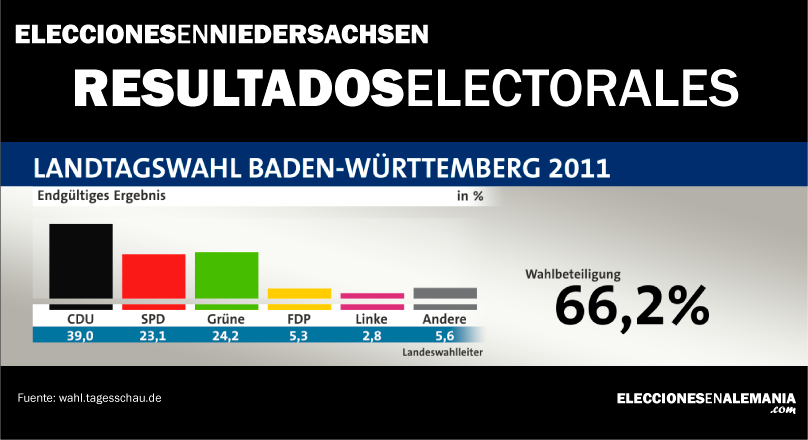 Las elecciones de marzo de 2011 son consideradas un verdadero hito en la historia del partido verde alemán. Esto no tiene tanto que ver con el resultado final (segunda fuerza con 24,2%) sino con la impresionante suba en relación con la última elección de 2006: +12,5%. En términos absolutos el partido de Kretschmann (Verdes) pasó de unos 460.000 votos en 2006 a más de 1.200.000 en 2011, un número que solo fue posible alcanzar gracias a un extraordinario aumento de la participación electoral de 13 puntos. Por su parte, la CDU de Mappus se ubicó en primer lugar con el 39% (-5,2%) y consiguío 60 escaños en el parlamento. No obstante, esto no bastó para estar en condiciones de organizar una mayoría. De nada sirvieron las siete bancas que aportaban los liberales del FDP. Estos últimos obtuvieron un pobre 5,3%, es decir la sangría de votos más importante de la elección en relación a 2006 con -5,4 puntos. El partido Socialdemócrata (SPD) se ubicó tercero con un 23,1%, a solo 1,1 puntos de los verdes pero con una leve caída respecto de 2006 de -2,1. El resto de los partidos, incluyendo a Die Linke, Piratas y Republikaner entre otros quedaron fuera del parlamento.