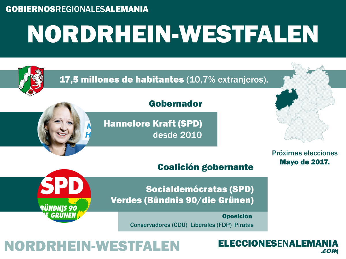 Con la excepción del período 2005-2010, Nordrhein-Westfalen es gobernado por el partido Socialdemócrata (SPD) desde fines de los años 60. Actualmente Hannelore Kraft ocupa el lugar de gobernadora (Ministerpräsidentin) de la región liderando una coalición con el partido Verde (Bündnis 90/die Grünen). Kraft ha sido mencionada en varias ocasiones como posible candidata a canciller para enfrentar a Angela Merkel. Estos rumores cobraron fuerza luego de la gran victoria de 2012, en la cual la líder socialdemócrata obtuvo un abultado 39,1% (más de 12 puntos por encima de la CDU). Sin embargo, ella negó los trascendidos sobre una eventual candidatura para las federales de 2013, que finalmente recayó en Peer Steinbrück, casualmente gobernador de esta región entre 2002 y 2005.