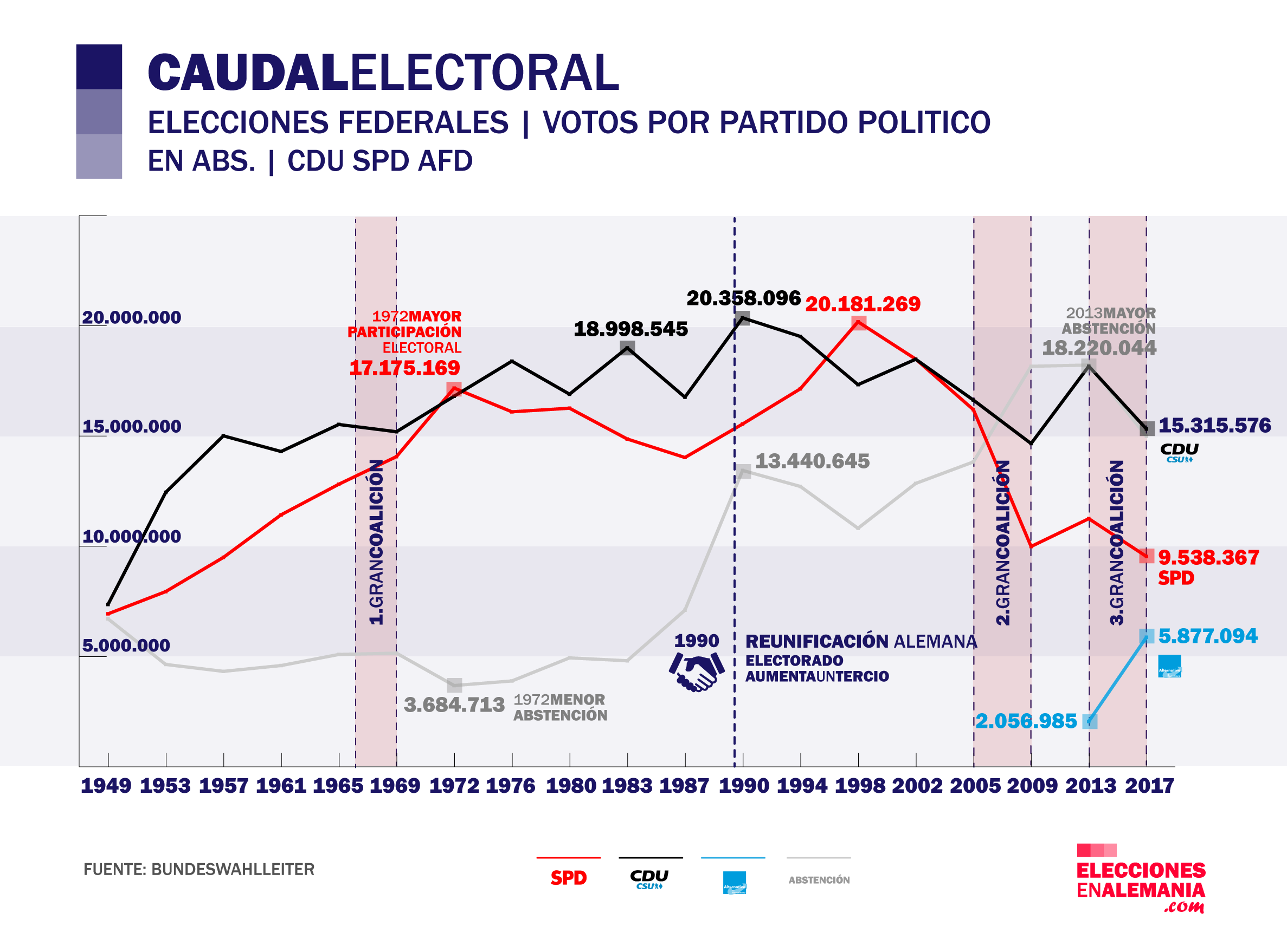 La abstención se duplica tras la caída del muro. La marca de trece millones de abstencionistas es igualada quince años más tarde, en 2005. En ese año Merkel lograba el triunfo por 1 punto de diferencia con el SPD. La agenda de reformas del canciller Gerhard Schröder le pasaba factura a su partido: cuatro millones de votos menos que cuando fue nombrado canciller por primera vez en 1998.
