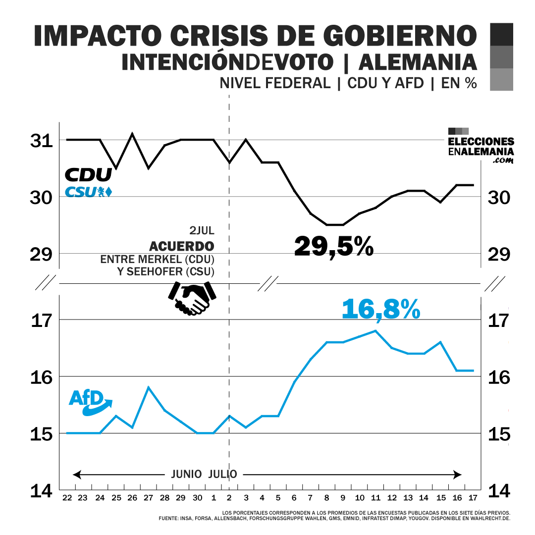 Pero por otro lado, el problema sigue allí porque el efecto deseado por los conservadores bávaros no fue el esperado. La derechización del discurso no ha impactado positivamente en la opinión pública y con ello la alianza entre democristianos y conservadores bávaros ha perdido en intención de voto. El conflicto no solo dañó a las figuras de la canciller y del ministro del Interior, las caras de este conflicto, sino que también impactó en las encuestas. En menos de un mes la CDU/CSU tocó el piso del 29% según los datos de INSA del 16 de julio. Un número histórico.