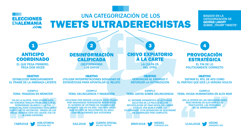 Esta categorización de Lakoff es aplicable al uso de las redes sociales de la nueva ultraderecha alemana, representada en el partido Alternative für Deutschland (AfD). Con algunas diferencias, la capacidad para conducir el debate público de AfD ha logrado resultados similares al del presidente estadounidense e incluso, en algunas áreas, hasta lo han superado.