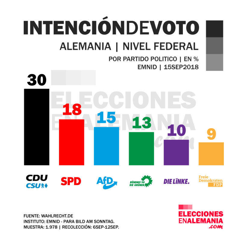 La intención de voto de septiembre en Alemania no ha cambiado demasiado en los últimos meses. El partido de Angela Merkel (Unión Demócrata Cristiana – CDU) sigue sin recuperarse del resultado electoral de hace un año y ronda los peores valores de su historia con apenas 30%. A duras penas la siguen los socialdemócratas (SPD), aunque ya hemos visto mediciones en las que quedan por debajo de los ultraderechistas (AfD). En todo caso, ambos pelean por el segundo lugar sin ser capaces de arrimarse al 20% de los votos. Los verden han crecido un poco y se han despegado del resto de los partidos minoritarios. En resumen, todo sigue igual.