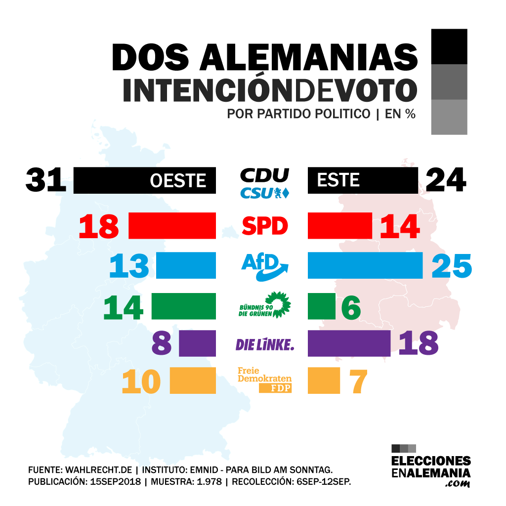 Ese panorama se torna más interesante si observamos esas mismas mediciones del instituto Emnid desagregadas en este y oeste de Alemania. Aquel viejo eje, que en los últimos años se utilizaba con menos frecuencia, hoy cobra sentido en la arena electoral.