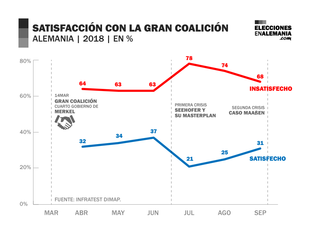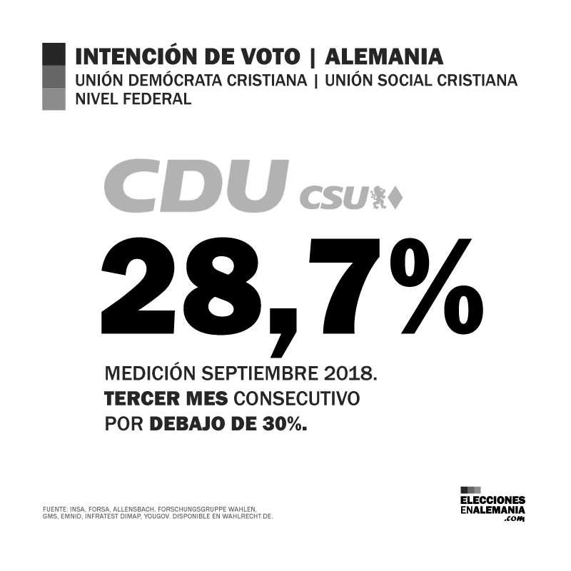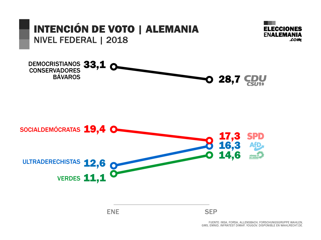 Lo que sucede dentro de gobierno impacta necesariamente en la opinión pública. Al menos las encuestas así lo reflejan. Para los mayoritarios las encuestas de intención de voto durante todo 2018 han tenido una sola dirección: hacia abajo. Tras la primera crisis de gobierno de julio pasado, el partido de Merkel y sus aliados bávaros han caído por debajo del 30%. Récord negativo histórico del cual hasta ahora no han sido capaces de recuperarse.