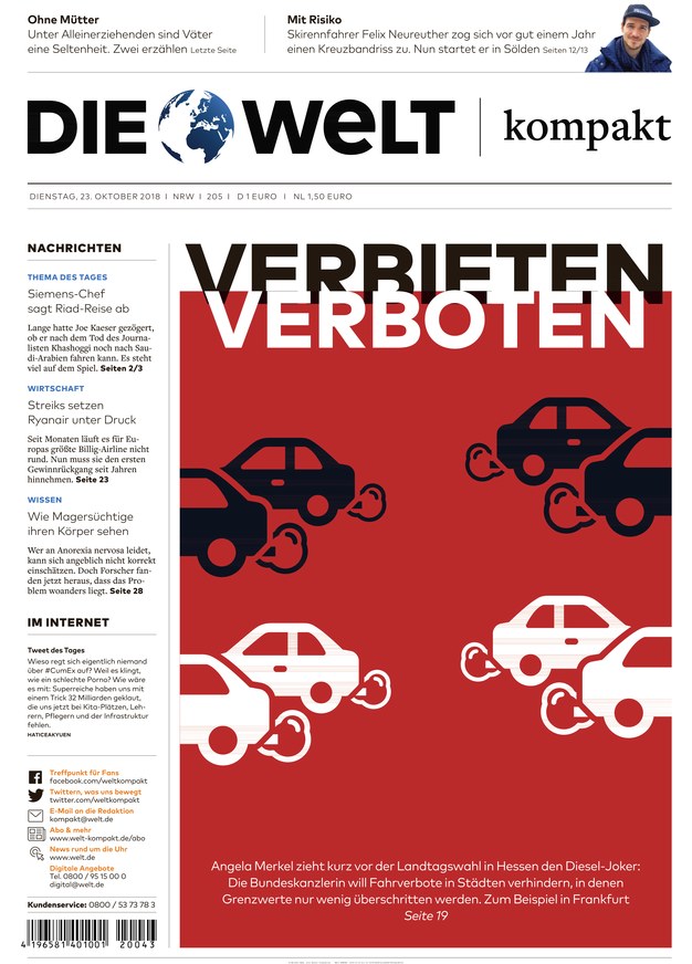 Las elecciones regionales están a la vuelta de la esquina. La canciller no quiere quedarse de brazos cruzados y ver como su CDU recibe otra bofetada. «Angela Merkel saca el comodín antes de los comicios en Hessen: La canciller quiere impedir que se prohiban la circulación de autos diesel en ciudades en las que los límites de contaminación apenas sean superados. Por ejemplo en Frankfurt». Eso dice la bajada de esta portada de Die Welt kompakt: