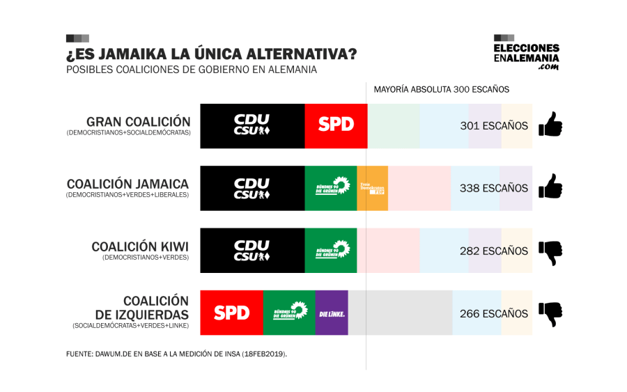 El fin de la gran coalición actual parece cristalizarse a medida que pasan los días. Las elecciones regionales en el este serán clave para un adelantamiento de las elecciones. En dicho caso sería casi ridículo pensar que CDU y SPD volverían a formar la misma alianza, la que acaban de romper. Eso daría lugar a la opción Jamaika, ya que el resto de las posibilidades están descartadas, ya sea por cuestiones ideológicas como por falta de números. Sin embargo, en septiembre de 2017, muchos, incluyendo algunos políticos muy importantes, sostenían la imposibilidad de una nueva gran coalición. Y la gran coalición se formó seis meses después.
