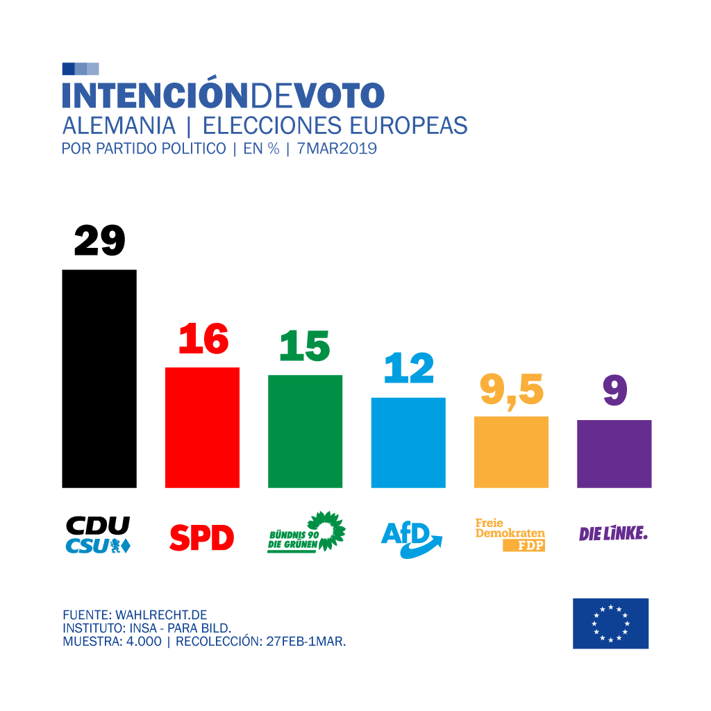 A poco más de dos meses para las elecciones europeas, la campaña electoral comienza a tomar forma. Ya se conocen las listas y sus candidatos. Y también ya es el tiempo de las encuestas preelectorales. En Alemania se dio a conocer a principios de mes una encuesta que dejó preocupados a varios partidos políticos. En especial, a los mayoritarios. Se trata de la Unión Demócrata Cristiana (CDU), la fuerza de la canciller Merkel, y del Partido Socialdemócrata (SPD). Ambos son quienes desde 2013 gobiernan el país en Gran Coalición. Una alianza que pierde popularidad de manera acelerada: apenas el 31% de los alemanes están contentos con ese gobierno (Infratest dimap, febrero 2019).