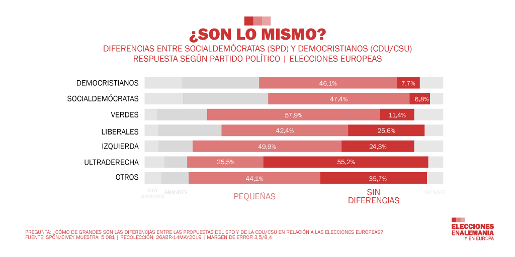 Esta medición de Civey y der Spiegel Online (SPON) muestra la actualidad de esta situación. A los encuestados se les preguntó ¿Cómo de grandes son las diferencias entre las propuestas del SPD y de la CDU/CSU en relación a las elecciones europeas?. Los resultados según partido político son los siguientes.