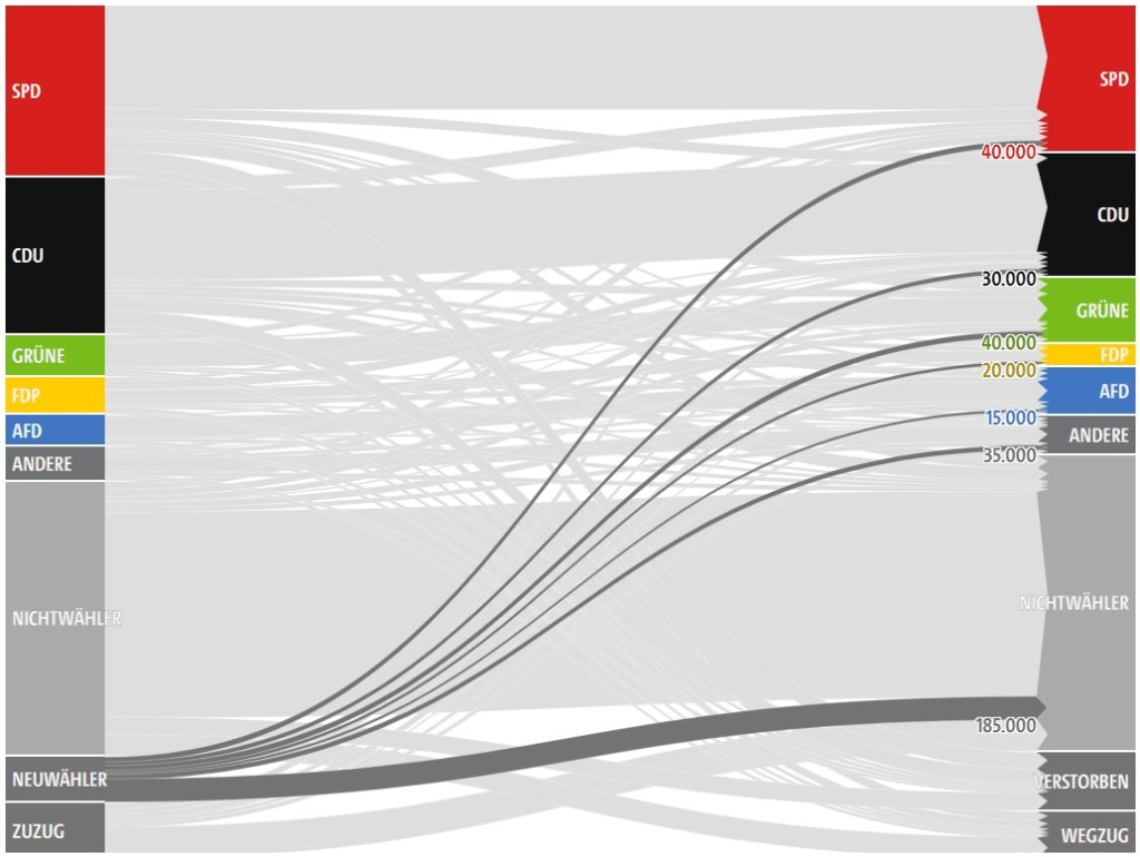 Casi el 10% del electorado del SPD como del de la CDU en 2017 ha muerto (Verstorben) en estos cinco años. Un vistazo a los nuevos votantes (Neuwähler) refuerza entonces lo dicho previamente: el escenario tiene a igualar a las fuerzas políticas. Al menos con los verdes en este Bundesland. Pero ¿te imaginas lo que sucederá en el este del país?