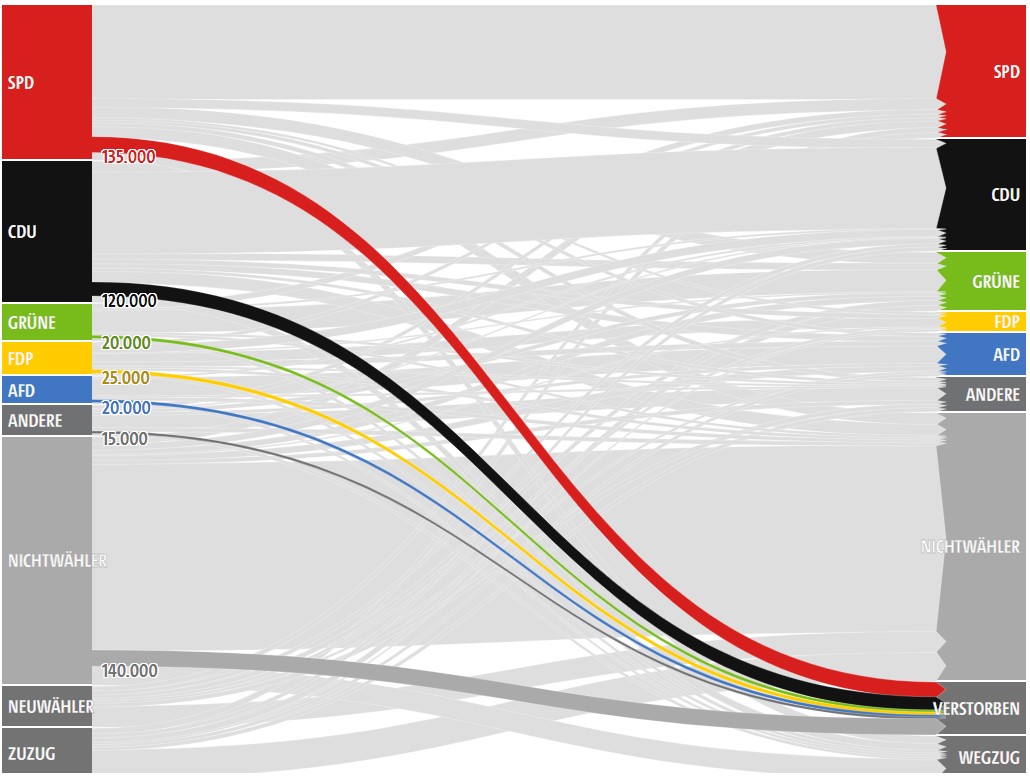 Además, si a eso le sumamos la cantidad de votantes que tanto CDU como SPD pierden por fallecimiento el escenario es, a mediano plazo, bastante negativo para ambas fuerzas políticas: