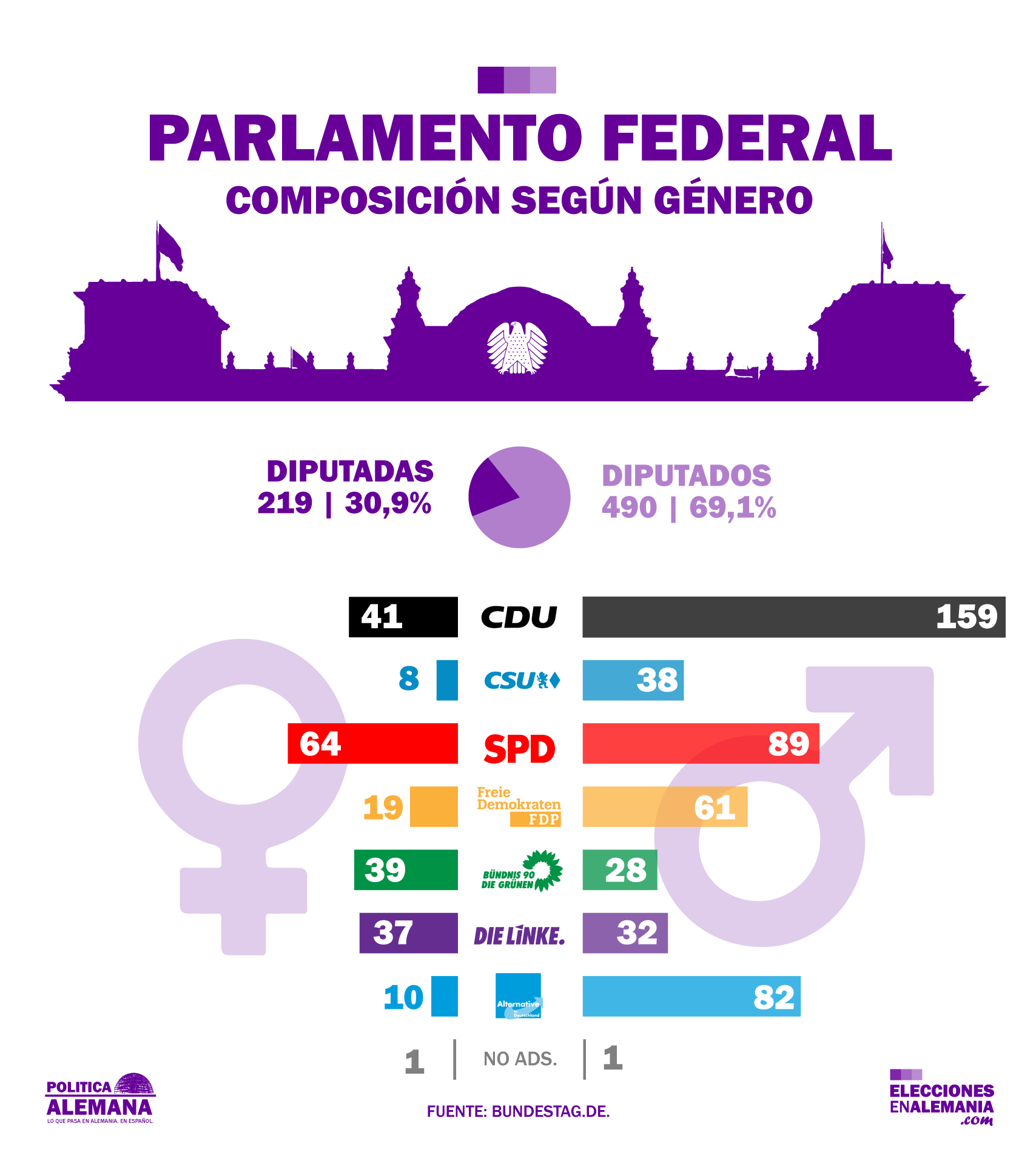 El panorama en el Bundestag tampoco mejora. El Parlamento alemán es, de hecho, tan masculino como durante las dos últimas décadas. En esta legislatura cuenta con 709 diputados, de los cuales 490 son hombres y 219 mujeres. Es decir, solo el 30 por ciento de las plazas corresponden a mujeres, porcentaje que incluso marca un retroceso respecto a la legislatura anterior (37 por ciento), y lo que es peor, iguala al de diputadas en 1998. Una evidencia, no solo de la sonrojante infrarepresentación de la mujer en la cámara baja, sino del alarmante retroceso.