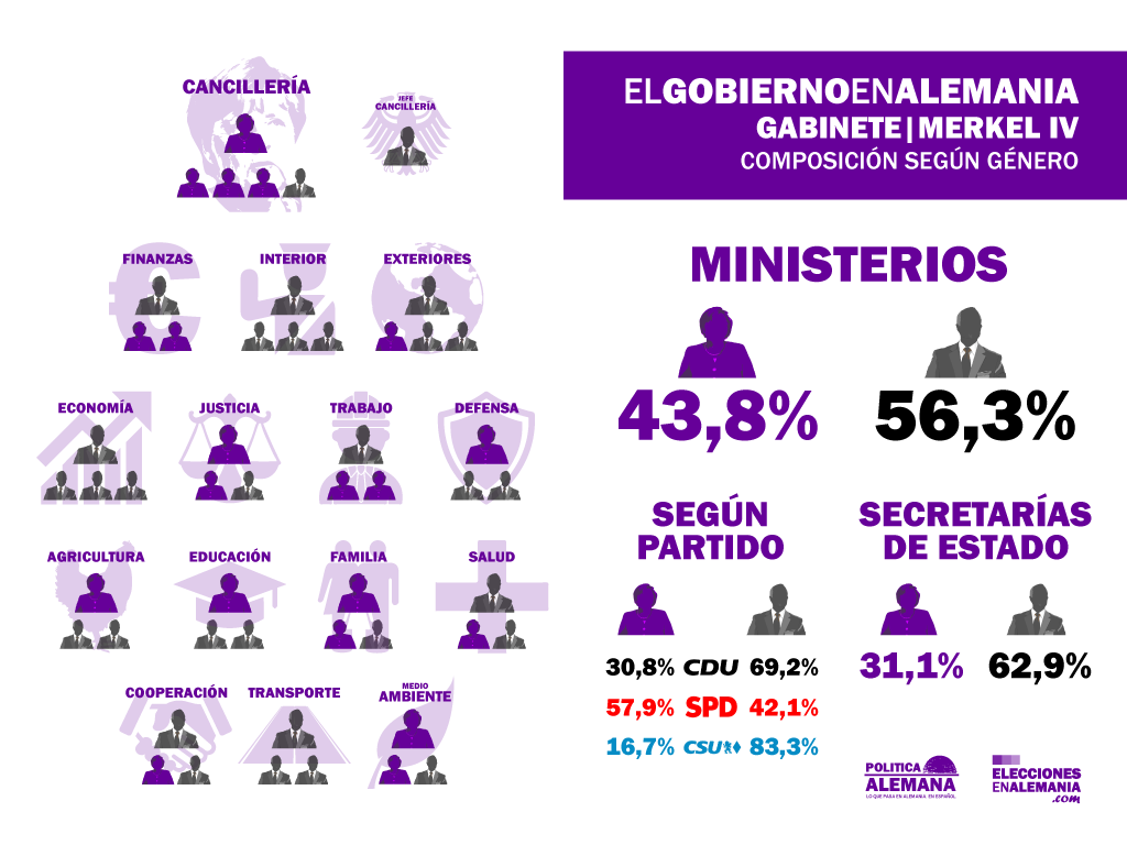 La canciller Angela Merkel, en cambio, dejó muy claro desde el principio, que su elección sería paritaria e incluso para conseguirlo sacrificó a uno de sus leales. Designó a tres hombres y a tres mujeres para los seis ministerios que ha asumido su partido, la Unión Cristiano Demócrata (CDU). Agricultura (Julia Klöckner), Defensa (Ursula von der Leyen) y Educación (Anja Karliczek) están dirigidos por mujeres, mientras que Economía (Peter Altmeier), Sanidad (Jens Spahn) y Asuntos Especiales (Helge Braun) son dirigidos por varones. Del mismo modo, el Partido Socialdemócrata Alemán (SPD) optó por un equilibrio en sus correspondientes seis ministerios: ha puesto Justicia (Katarina Barley), Familia (Franziska Giffey) y Medio Ambiente (Svenja Schulze) en manos de mujeres, pero ha reservado las carteras más relevantes a los varones: Finanzas (Olaf Scholz), Asuntos Exteriores (Heiko Maas) y Trabajo (Hubertus Heil). Sólo con que la CSU bávara hubiese nombrado a una ministra, se habría configurado el primer gabinete con igualdad de género en la historia de la República Federal.